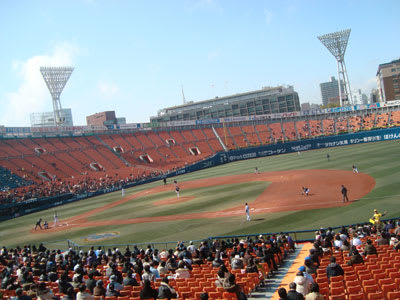 午前中は、雨が降っていたんで、『どうかな~』と思っていたんですが、スタジアムに着き、1時のプレイボールの時にはもう、青空も見えポカポカ陽気に♪