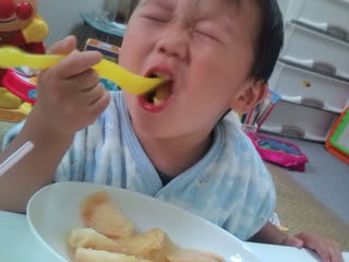 『颯斗、美味しい?』って聞いてカメラ向けると 必ずと言っていいほどこのお顔(@_@) 本人曰わく 「さいこー」らしいです(笑)