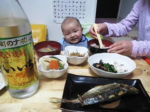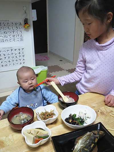 初めてのお食事は、おねーちゃんに味噌汁をいただきます♪