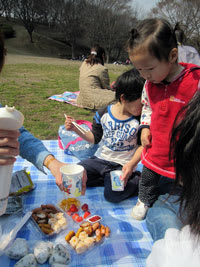 弁当の後は、みんなで池や川に行って、亀の甲羅干しを見たり、おたまじゃくしなどの水辺の生き物を捕まえたりして楽しみました。