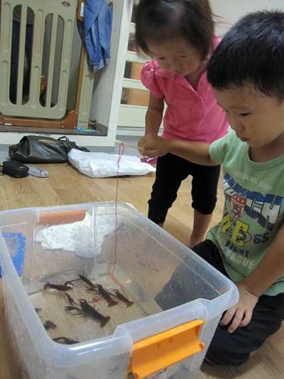 さらに、もっとうまくなろう!と、持って帰ったザリガニに向ってまた釣りしてんの(笑)