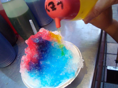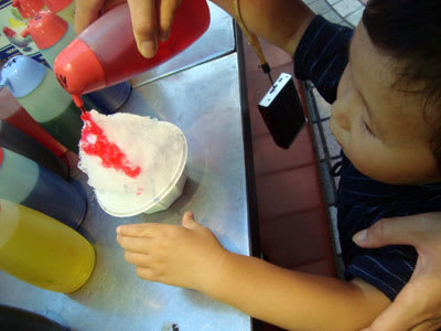店員の目も、味も、気にせず、または溶けた時に残るシロップがもの凄い色になる事も気にせず、ただひたすら色んな味を乗せていく。