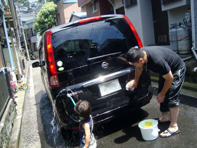頭から水をかぶりながらの水浴び洗車 __(´▽`)♪__| <イイ水ダナァw♪