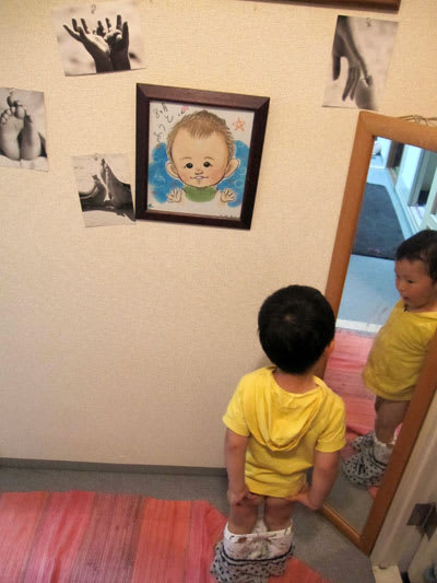 さて、玄関に置いてある鏡の前で、颯斗がパンツを下ろしてもぞもぞしています。