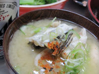 そのさばいた時に出た、アラや卵をのっちょに味噌汁にしてもらいました。