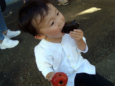 こんなに大きな口を開けてにぎり・食い物・・喰らうなんて、きっと大きな声出して、汗かいたから・・腹が減ったんだろうね!