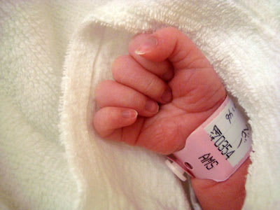 病院では、長い長い・・産道の旅を終えた娘が、ガッツポーズをして寝ています。
