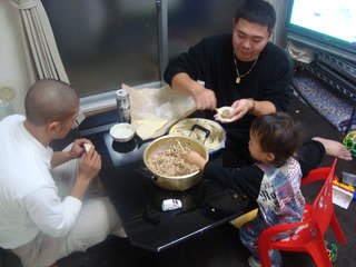 そんな訳で、何かとお客様が多い我が家ですので、のっちょの負担を軽くしようと、私達男三人で餃子を作りました。