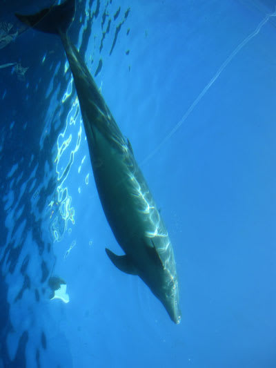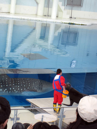 このプールにジンベイザメが居るから、イルカ達はビビっちゃってジャンプなどをしないんだって、だからショーの内容に、イルカのジャンプなどのメインショーがありませんでした。