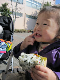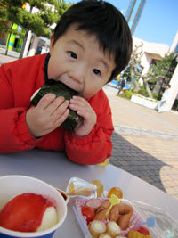 昨日の昼間は、日向にいると本当にポカポカ温かかったので、日向の温かいパラソル付のベンチの所で、のっちょの作った弁当を喰らいました。