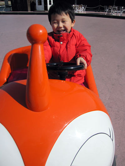 さっ!水族館に行こう!!と歩き出したところで、これまた颯斗の大好きなゴーカートの小さい番を発見!!200円入れて、足元のボタン踏むと走るやつです。