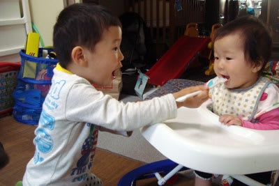 いつのまにか・・妹にスプーンを運んでくれる程成長していましたね♪