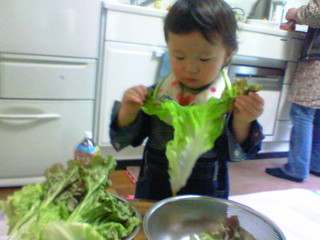 お次はサラダのレタスをちぎってます☆