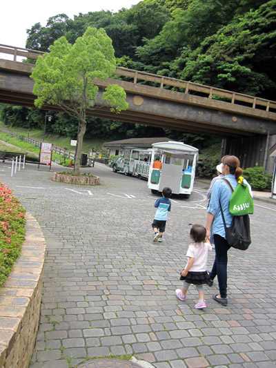 園内に到着してすぐ、入口の所に園内を回る汽車形のバスの停留所があります。