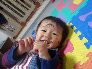 おいおい・・ 帰ってきたら、この顔(爆) 自分の顔に落書きって、ある意味器用だね♪