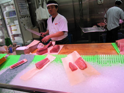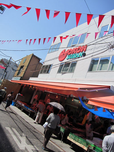 いつもは、ものすごい人で、マグロもセリみたいな販売方法で買うのが大変だけど、今日は、マグロを切ってる人に、こちらから金額とお好みを注文できました。