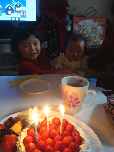 イブの時のデコレーションとはまた違う、いちごをベースにしたフルーツケーキです☆