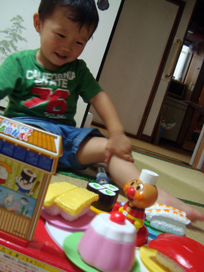 大好きな回転寿司のおもちゃでも、いい顔で遊んでいました。