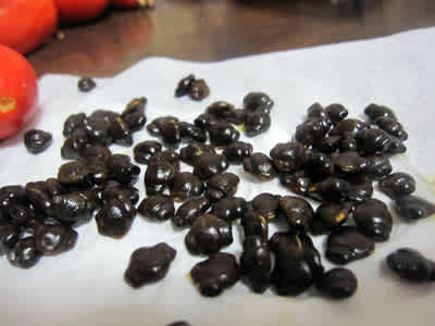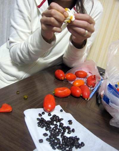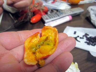 ちょっとお世辞でもいい感触とはいえませんが、べちょねちょをとりながら果肉を除いてみると、面白い形をした、1cm前後の真っ黒な種がでてきます。