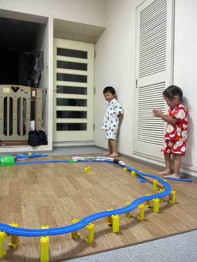 帰宅して、風呂沸かしてる間に、プラレールの線路を作らされて、結構な大作を作ったのに、りこ怪獣に襲撃されて、すぐバラバラされ。。