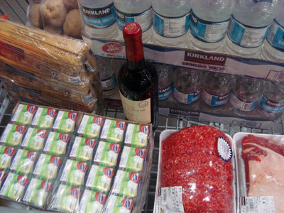 水、パスタ、颯斗のりんごジュース、じゃがいも、ワイン、それに挽肉とステーキ☆
