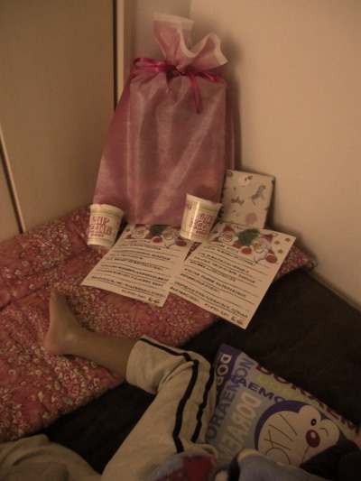 サンタさんは寒いからカップヌードルを食べようと思ったんだけど、ふうとの家のお湯がわからないから、ふうととりこに置いていったんだよ♪