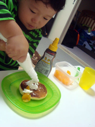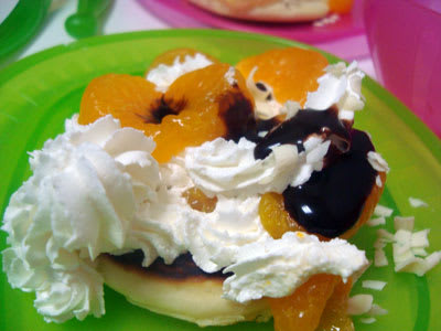 生クリームや、果物や、チョコなどを自分でトッピングしていきます。