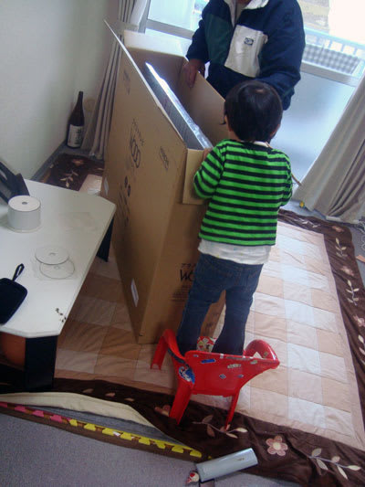 あまりにもデカいダンボールに、颯斗も『なにこれ?なにこれ??』と興味津々。。しまいには、自分の椅子を持ち出してのぞいていました(笑)