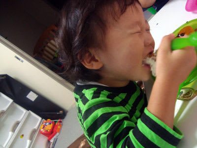 自信作にかぶりつく兄。
