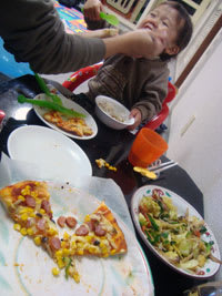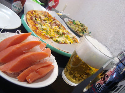 昨日は、ピザとサーモンのお刺身そして、野菜炒め。