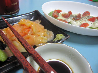 『は~いお待たせ♪今日のつまみは、大好きな青柳の刺身と、モッツアレラチーズとアボカドで~す!』