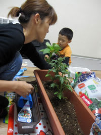 買ってきたプランターに土を入れ、その土の中に苗を植える。