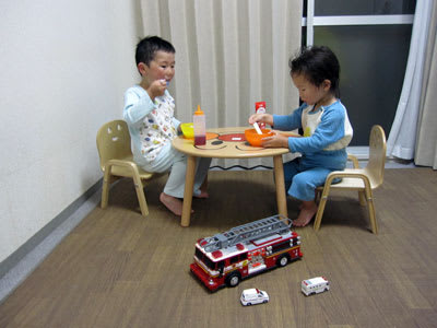 一足早いカキ氷を2人で喰らうわが子を見ながら・・