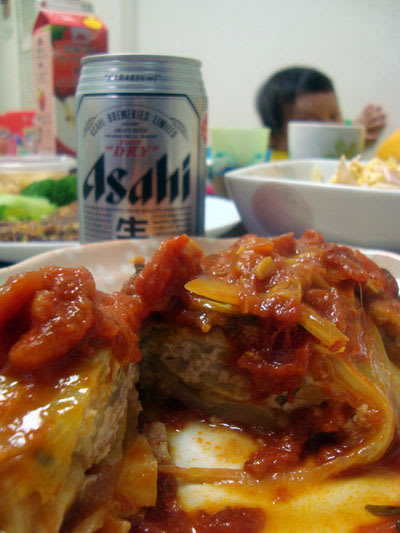そして、スパゲティーサラダに、メインがこれまたリクエストの大判ロールキャベツです。