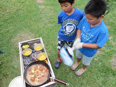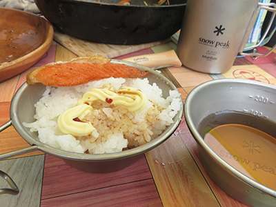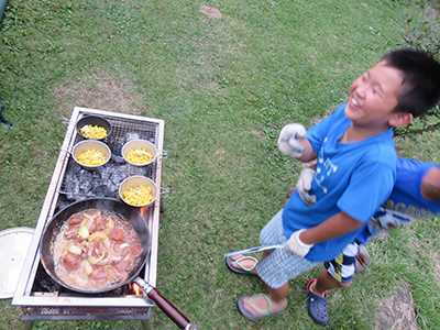 飯盒でごはん焚いて、肉焼いて、トウモロコシやいて・・・楽しいです♪