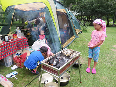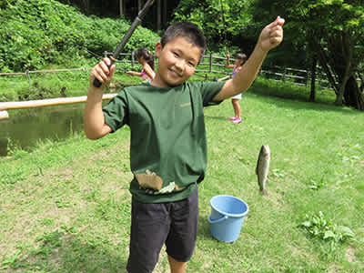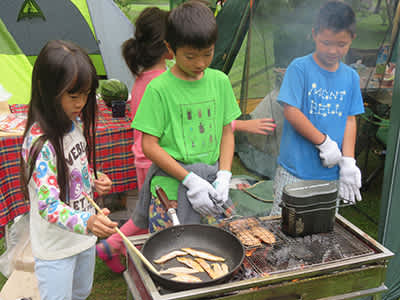 キャンプサイト場には、ニジマスが釣れる釣り堀があるので、子供達で7匹釣り上げて、塩焼きにしました。