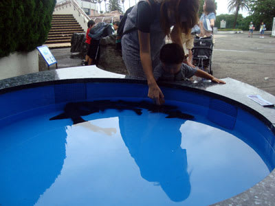 館内の入り口脇には、小さいな浅いプールがあって、小さなサメが泳いでいます。そんなサメに、じかに触れるんだからビックリ。