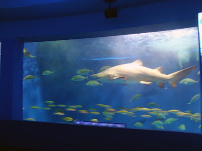 館内の2階は、360℃、ドーナツ型の巨大水槽になっていて、その中を魚達が回遊する形になっています。巨大な鮫が他の魚たちと泳ぐ姿は、迫力がありました。