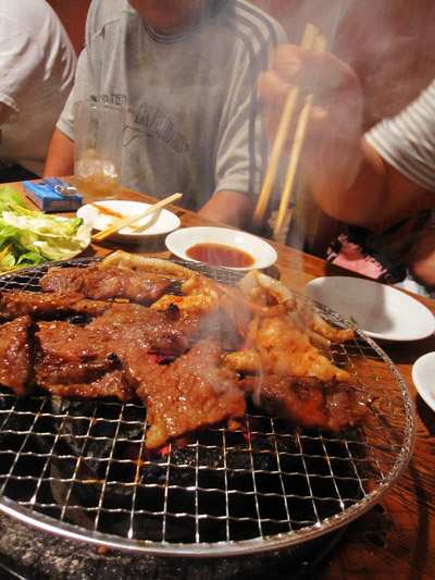 炭の上に時下に置いた網で焼くから、煙もすごいくて目が痛いし、直火がすげ~近くて暑いんだけど・・