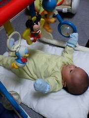 午前中はご機嫌で、トトロと遊んだよ♪ まだ上手く持てないけどね… 最近は、音の出る玩具とか見ると、ニコニコして遊ぶようになりました☆