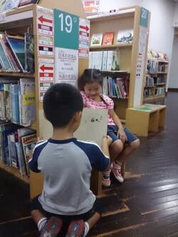 昨日ちょっと遠出したので、今日は近場で♪ お馴染みの野毛山動物園~図書館へ☆ 颯斗が紙芝居読んであげてる(^-^) 成長したなぁ~♪