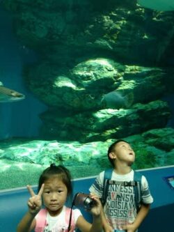 3人で電車に乗ってドキドキ o(^o^)o 今日は子供達の希望通り、水族館に来ました~♪