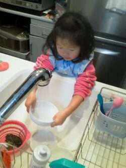 今日もお手伝いしてくれてます☆ 食器7つ洗うのに30分以上もかけて、袖口びしょびしょにしてるけど、一生懸命やってたよ(^_^)v 昨日は包丁使ってリンゴも切ってくれました♪ 早く璃心の手料理食べたいわ~(*^_^*)