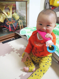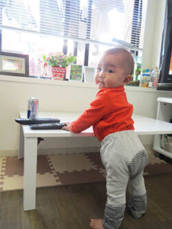 つかまり立ちしてます♪ 親として、本当に成長がうれしくて、たまらん(*´艸`*) って、快斗のドヤ顔がウケますね♪