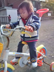 早くも自転車デビュー!? 教えてないのに、ペダルに足のせてこいだ!! 見て覚えてるんだね~。 恐るべし(*_*)