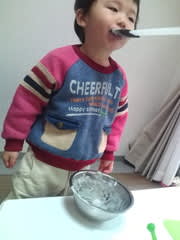 ただいまパパにバレンタインチョコを作成中☆ 颯斗もお手伝い(^-^) ・・・使い終わった調理器具舐めてる( ̄□ ̄)! このあとボールに顔つっこんで舐めたのは言うまでもない(笑)