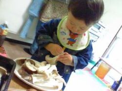 颯斗に夕飯のお手伝いをしてもらいます! まずはシメジをほぐしてもらってるとこ(^-^) 大好きなキノコを目の前にして、美味しそ~♪とか、おっきーね~☆といいながら、黙々とやってくれてます!