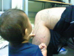 颯斗画伯、お絵かき中です! 父の足に落書きしちゃった(笑)