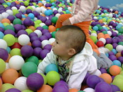 ボールのプールで溺れる颯斗(゜_゜) うまくハイハイできないし、思い通りに動けないし、最後は怒ってました(`へ´)