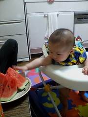 ちょっと自分で動けるようになったからって、もうイタズラが始まりました(^_^; 颯斗はスイカが大好きなんだよ(≧∇≦)/